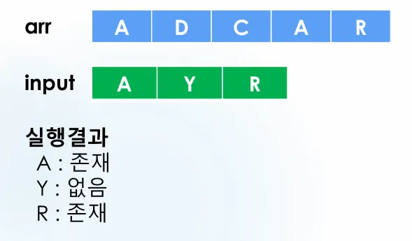 문자 3개를 입력받고, 입력받은 문자들이 arr배열에 각각 존재하는지 확인하는 방법입니다.