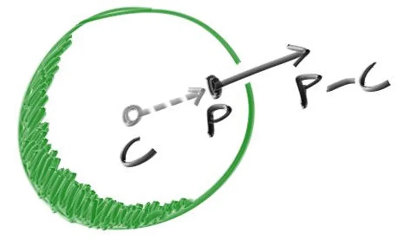 구의 경우, 외향 법선은 충돌점에서 중심을 뺀 방향입니다.