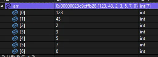 배열의 주소: 0x000000023c9ffb28 {123, 43, 2, 3, 5, 7, 0} int[7]