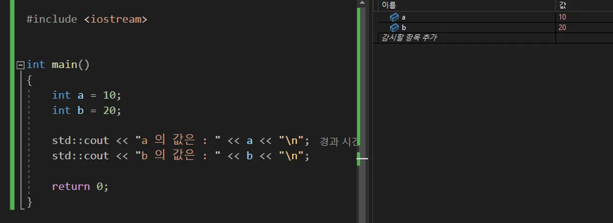 눈으로 확인하기 위해서는 조사식 창을 활용해서 값을 확인하고 해당 코드가 어떻게 실행될지 유추하는 과저을 거쳐야 한다.