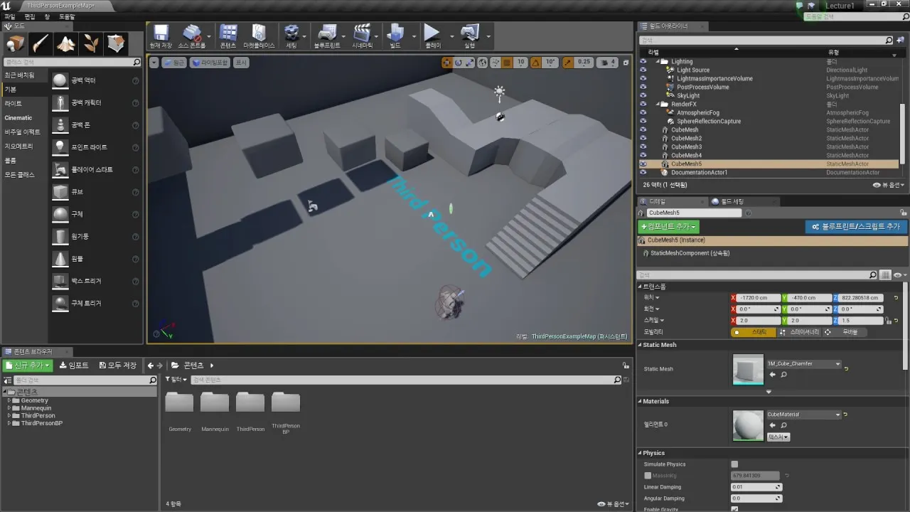 레벨 디자인: 게임의 월드나 맵을 설계하는 도구로, 오브젝트를 배치하거나 지형을 조성하고, 조명 및 이펙트를 추가하는 등 게임 공간을 시각적으로 구성할 수 있습니다.