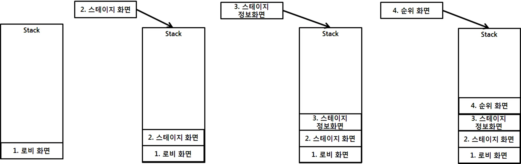 : 유저의 상호작용에 의해 변화되는 화면이 안드로이드의 Activity 관리 ( Stack )와