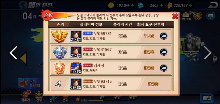 4. 스테이지 정보 화면에서 순위 버튼 선택 -> 순위 화면 ( 팝업 화면 )