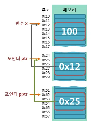int** pp = &p: 포인터의 포인터 pp가 p의 주소 저장