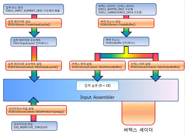 렌더링 파이프라인이 올바르게 동작하려면 [ IA에 입력될 데이터의 구조 ] 와 [ 버텍스 셰이더 함수에의 입력데이터의 구조 ]가 일치해야 한다.