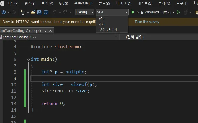 x64는 64비트 컴파일이되고 x86 32비트로 컴파일이 된다.